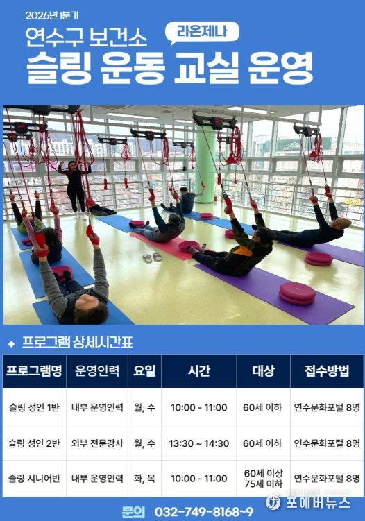 [ 포에버뉴스 김경순 기자 ] 연수구 보건소는 오는 19일부터 23일까지 2026년 1기 ‘슬링 운동프로그램’ 참여자를 모집한다.