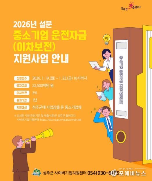 [ 포에버뉴스 사공선 기자 ] 성주군은 설 명절을 앞두고 관내 중소기업의 자금 부담 완화를 위해 2026년도 중소기업 운전자금(이차보전) 설 명절분을 225억원 규모로 지원한다.