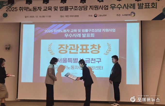 유성훈 금천구청장은 “이번 수상은 노동약자를 위한 금천구의 노력이 인정받은 의미 있는 성과”라며 “어려움에 처한 노동자들이 지역에서 쉽게 도움을 받을 수 있도록 상담과 지원체계를 더욱 강화하겠다”라고 밝혔다.