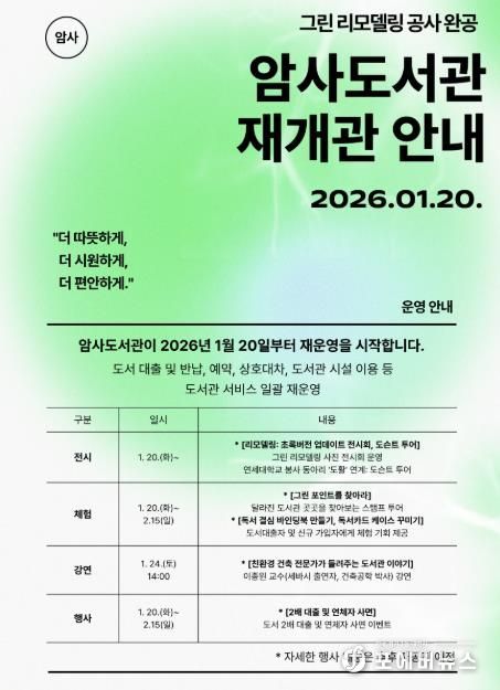 아울러 1월 24일에는 건축공학 전문가 이종원 교수를 초청해 ‘친환경 건축 전문가가 들려주는 도서관 이야기’ 특강을 열어 그린 리모델링의 가치를 구민들과 공유한다. 이밖에도 바인딩북·키링 만들기 체험과 도서 2배 대출, 연체자 사면 이벤트 등 책 읽기를 독려하는 다양한 행사가 마련된다.