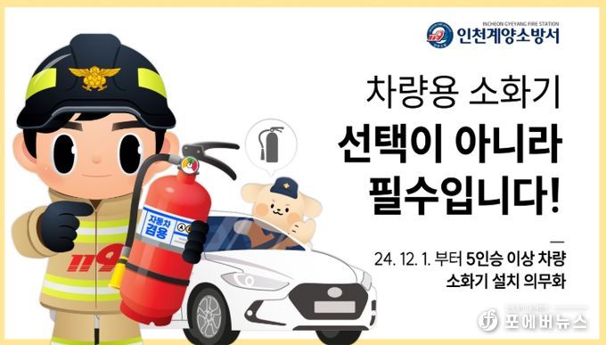 [ 포에버뉴스 김경순 기자 ] 계양소방서는 차량 화재 시 신속한 초기 대응과 피해 저감을 위해 차량용 소화기의 비치를 당부한다고 19일 밝혔다.