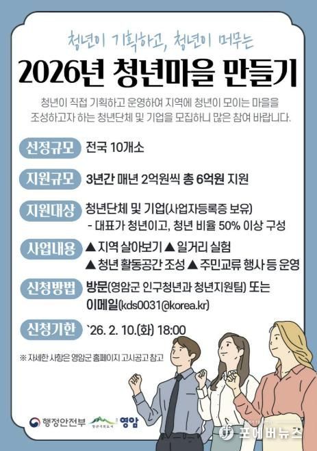 [ 포에버뉴스 오명숙 기자 ] 영암군이 행정안전부 ‘2026 청년 마을 만들기 사업’에 참여할 청년단체를 다음달 10일까지 공개 모집한다.