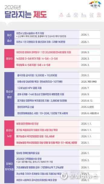 [ 포에버뉴스 박정배 기자 ] 이천시가 2026년 새해를 맞아 시민 생활과 밀접한 달라지는 제도를 발표했다.