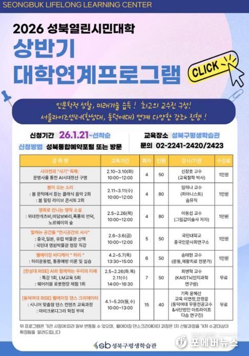 [ 포에버뉴스 김경순 기자 ] 서울 성북구가 2월부터 5월까지 구민을 대상으로 ‘2026 상반기 열린시민대학’을 운영한다.