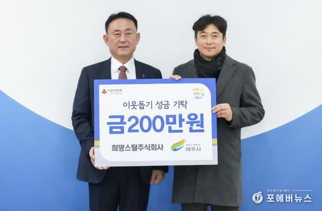 [ 포에버뉴스 박정배 기자 ] 지난 19일 여주시 삼교동 소재 희망스틸주식회사 김영기 대표는 여주시를 방문하여 이웃돕기 성금 200만원을 기탁했다.