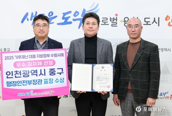 [ 포에버뉴스 김경순 기자 ] 인천시 중구는 행정안전부가 주관한 ‘2025년 기후 재난 대응 우수 지자체’에 선정돼 행안부 장관 표창의 영예를 안게 됐다고 21일 밝혔다.
