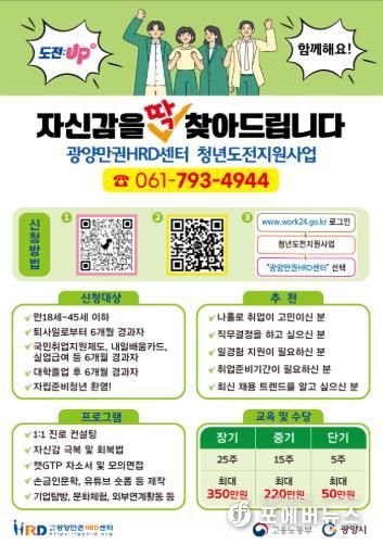 광양시 관계자는 “이번 청년도전지원사업이 취업 시장에서 멀어졌던 청년들에게 다시 한번 도전할 수 있는 계기가 되길 바란다”며 “프로그램 이수 후에도 국민취업지원제도, 일경험 사업 등 다양한 지원사업과 연계해 청년들이 안정적으로 취업에 성공할 수 있도록 적극 지원하겠다”고 밝혔다.