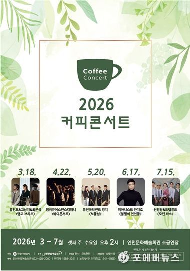 [ 포에버뉴스 김경순 기자 ] 인천문화예술회관(관장 홍순미)이 간판 브랜드 공연 〈커피콘서트'의 2026년 상반기 출연진을 공개한다.