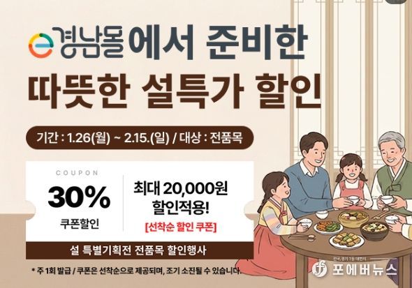 [ 포에버뉴스 사공선 기자 ] 경상남도와 (재)경상남도투자경제진흥원이 운영하는 e경남몰은 1월 26일부터 예산 소진 시까지 ‘2026년 풍성한 설맞이 할인 기획전’을 진행한다.