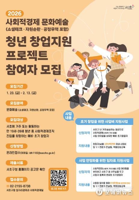 최종 선정팀은 심사를 거쳐 3월 중 결정되며, 오는 4월부터 12월까지 사회적경제 기업 진입을 목표로 프로젝트를 추진하게 된다. 참여 신청은 이메일로 가능하고, 자세한 사항은 서초구청 누리집의 모집 공고문 확인하거나 일자리경제과로 문의하면 된다.