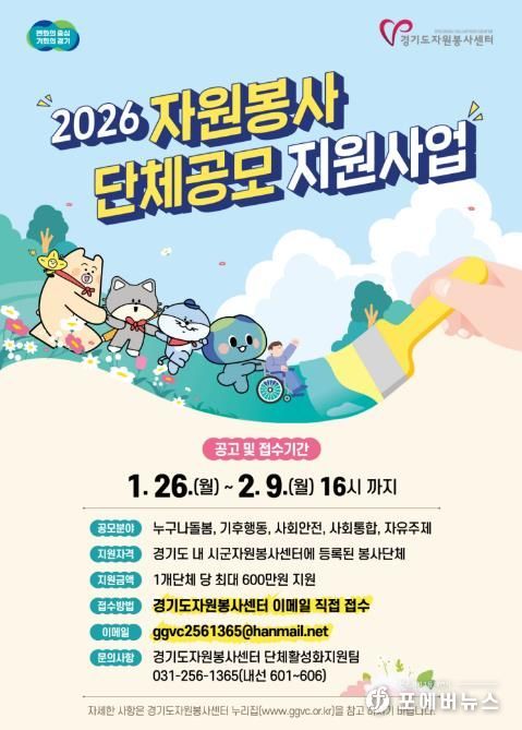 신청 접수는 1월 26일부터 2월 9일 오후 4시까지이며, 전자우편을 통해 신청 서류를 제출하면 된다. 공모 세부 내용과 신청 방법은 경기도자원봉사센터 누리집에서 확인할 수 있다.