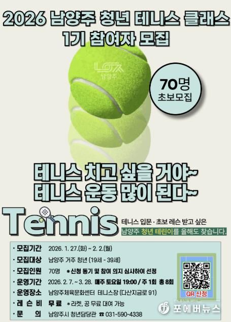 [ 포에버뉴스 김경순 기자 ] 남양주시는 27일부터 내달 2일까지 ‘2026 남양주 청년 테니스 클래스 1기’ 참여자를 모집한다고 밝혔다.