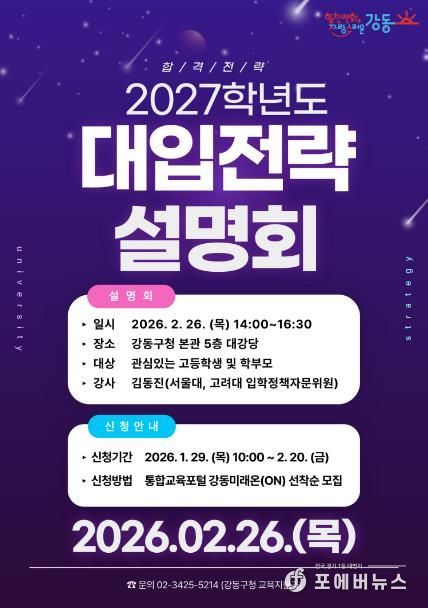 [ 포에버뉴스 김경순 기자 ] 서울 강동구가 2027학년도 대학입학전형에 대비한 올해 첫 대입전략설명회를 오는 2월 26일 강동구청 5층 대강당에서 개최한다고 28일 밝혔다.