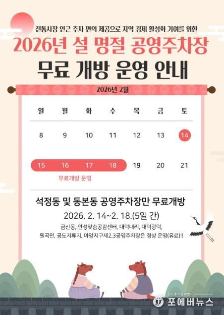 [ 포에버뉴스 김경순 기자 ] 안성시시설관리공단은 2026년 설 명절을 맞아 2월 14일부터 18일까지 5일간, 공단이 관리하는 공영주차장 중 전통시장 인근에 위치한 석정동 공영주차장과 동본동 공영주차장을 한시적으로 무료 개방한다고 밝혔다.