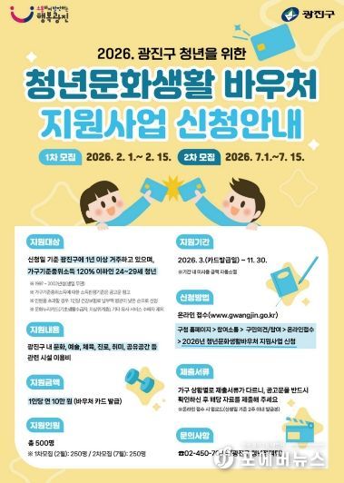 지원 대상은 광진구에 1년 이상 연속해 거주 중이며, 가구 기준중위소득 120% 이하인 24세~29세 청년이다. 상·하반기 1·2차에 걸쳐 각 250명씩 선발해 총 500명에게 1인당 10만 원의 문화생활비를 바우처 카드로 지급한다. 1차 신청은 2월 1일부터 15일까지 광진구청 누리집에서 온라인으로 진행한다.