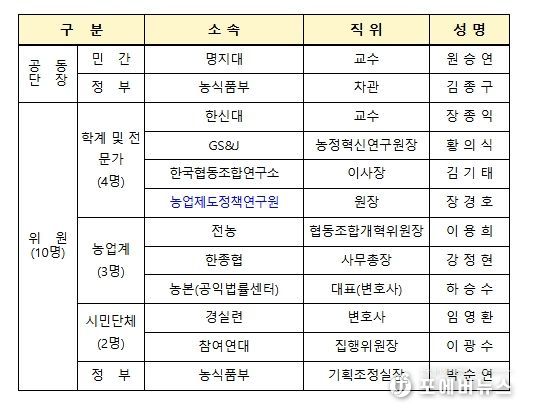 ‘농협 개혁 추진단’은 명지대 원승연 교수와 농식품부 김종구 차관이 공동단장을 맡는 민·관 합동 논의기구로, 농업계와 시민사회 분야, 협동조합·금융·법률 분야의 전문성을 갖춘 12명의 위원(단장 포함)으로 구성됐다.