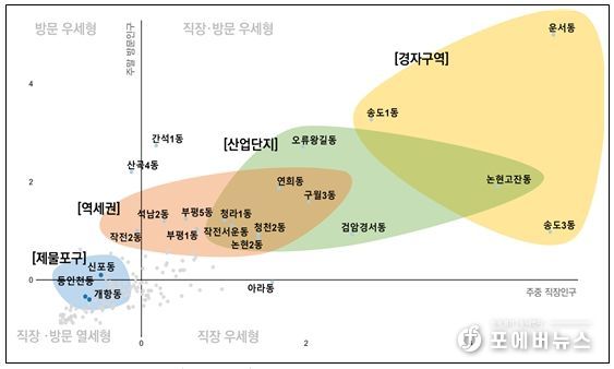 직장·방문인구 모두 많은 지역은 송도(4개 동), 영종(운서동), 청라(3개 동)와 부평(6개 동), 구월(5개 동), 주안(2개 동)으로 나타났는데, 공통적으로 교통접근성이 우수하고, 상업·업무·산업기능이 집적된 지역에 집중되는 경향을 보인다.