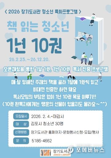 [ 포에버뉴스 김경순 기자 ] 김포시 장기도서관은 청소년의 자발적인 독서 습관 형성을 위해 청소년 특화프로그램 ‘책 읽는 청소년 1년 10권’을 오는 2월 23일부터 연말까지 운영한다.