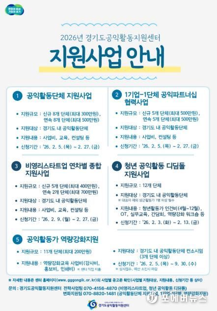 [ 포에버뉴스 김경순 기자 ] 경기도공익활동지원센터가 ‘2026년 경기도 공익활동 지원사업’에 참여할 도내 공익활동 단체를 모집한다.