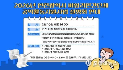 이번 설명회는 인천시에 등록된 비영리민간단체 중 '2026년 인천광역시 비영리민간단체 공익활동 지원사업'에 참여를 희망하는 단체를 대상으로 인천시청 본관 2층 대회의실에서 진행된다.
