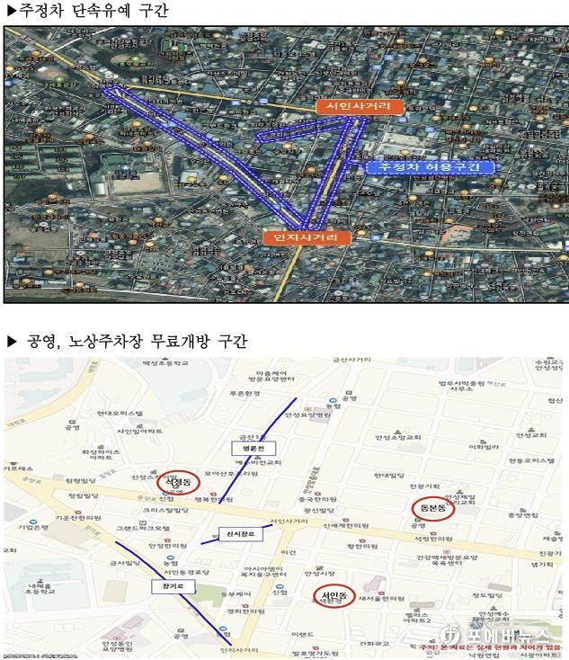 주정차 단속 유예 구간은 안성맞춤시장(서인사거리~인지사거리 구간 양측 300미터)과 중앙시장(서인사거리~안성농협 양측 100미터, 석정삼거리~인지사거리 양측 500미터) 주변 도로이며, 서인동·동본동·석정동의 건축식 공영주차장과 전통시장 주변 노상주차장이 무료 개방된다.