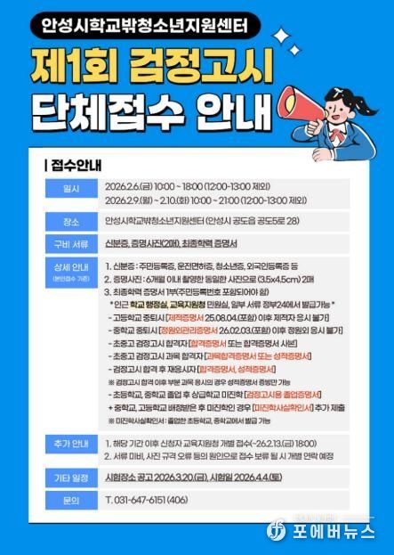 [ 포에버뉴스 김경순 기자 ] 안성시학교밖청소년지원센터는 오는 4월 4일 시행되는 2026년도 제1회 검정고시와 관련하여 단체원서접수를 진행한다고 밝혔다.