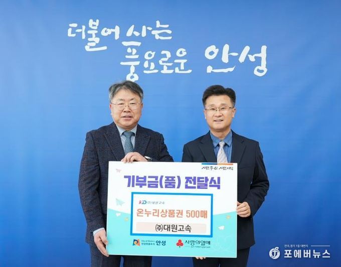 [ 포에버뉴스 김경순 기자 ] 안성시는 2월 3일 대원고속으로부터 지역의 어려운 이웃을 돕기 위한 온누리상품권 500매(500만 원 상당)를 전달받았다고 밝혔다.