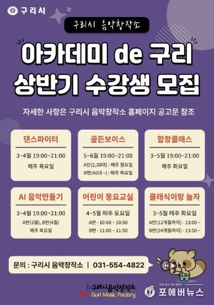 [ 포에버뉴스 김경순 기자 ] 구리시는 잠재적 예술인 양성을 위해 구리시 음악창작소에서 운영하는 '2026 상반기 아카데미 de’구리'의 수강생을 2월 2일부터 모집하고 있다고 밝혔다.