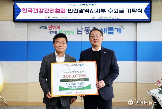 [ 포에버뉴스 김경순 기자 ] 인천시 남동구는 한국건강관리협회 인천광역시지부(본부장 이상철)로부터 어려운 이웃을 위한 후원금 300만 원을 기탁받았다고 6일 전했다.