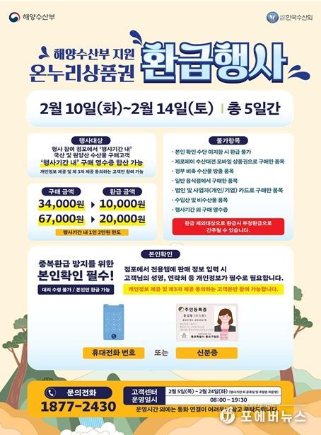 환급 기준은 3만 4,000원 이상 구매 시 1만 원, 6만 7,000원 이상 구매 시 2만 원을 온누리상품권으로 각각 돌려받을 수 있다. 단, 지급되는 온누리상품권이 소진될 경우 조기 종료될 수 있다.