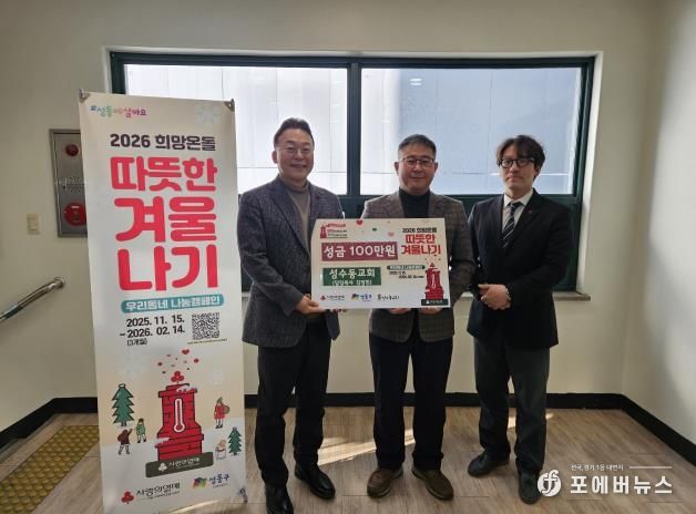 이날 성수동교회는 지역사회 나눔 실천의 일환으로, 김정한 담임목사와 김에녹 부목사가 참석한 가운데 성금 100만 원을 기탁하며 겨울철 취약계층을 위한 따뜻한 나눔의 뜻을 전했다.