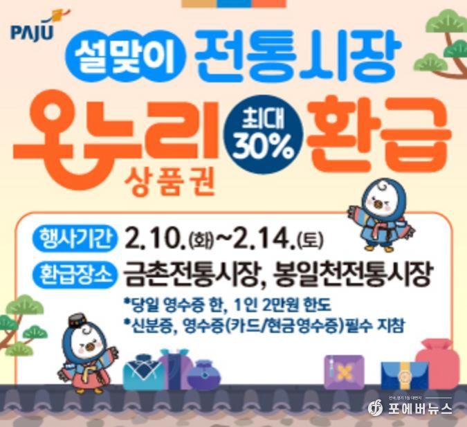[ 포에버뉴스 김경순 기자 ] 파주시는 2026년 설 명절을 맞아 고물가로 인한 시민들의 가계 부담을 덜고 지역 전통시장 활성화를 도모하기 위해 ‘설맞이 농축산물 온누리상품권 환급 행사’를 실시한다.
