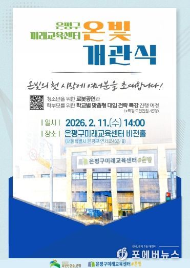[ 포에버뉴스 김경순 기자 ] 서울 은평구는 오는 11일 청소년 미래역량 강화를 위한 미래교육 거점공간인 ‘은평구미래교육센터 온빛’ 개관식을 개최한다고 밝혔다.