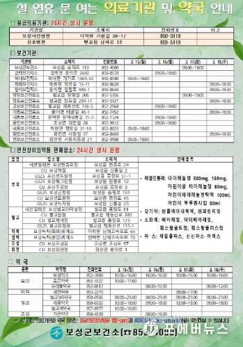 한편, 설 연휴 기간 시설 운영 및 휴관 정보는 보성군청 누리집에서 확인할 수 있으며, 생활 불편 사항은 종합상황실 및 읍면사무소(행정복지센터)로 문의하면 된다.