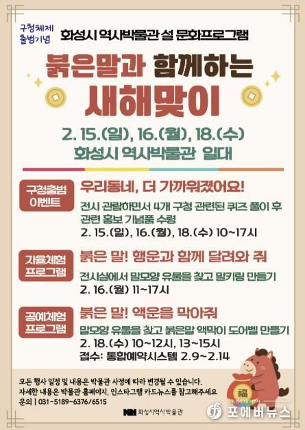 [ 포에버뉴스 김경순 기자 ] 화성특례시는 설 연휴 기간인 오는 2월 15일부터 18일까지 화성시 역사박물관에서 ‘붉은 말과 함께하는 새해맞이’ 설날 문화프로그램을 운영한다.