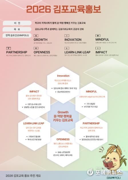 2026년 김포교육 홍보 정책의 핵심은 김포교육 공식 홍보 캐릭터 ‘포리(POLI)’ 도입이다. 포리는 김포(GIMPO)와 배움(Learn), 연결(Link), 도약(Leap)의 의미를 담은 상징 캐릭터로, 김포의 대표 상징인 볍씨를 모티브로 하여 학생의 성장 가능성과 미래교육 가치를 표현하고 있다.