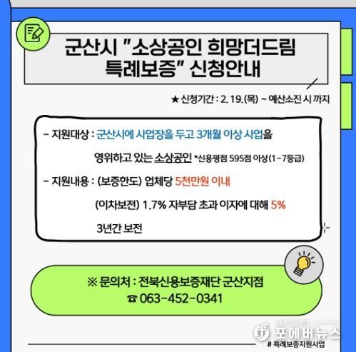 [ 포에버뉴스 이승훈 기자 ] 군산시가 장기화된 경기 침체와 고물가로 어려움을 겪고 있는 관내 소상공인들의 자생력 강화와 경영 안정을 위해 ‘2026년 소상공인 특례보증 지원사업’을 본격적으로 시행한다.