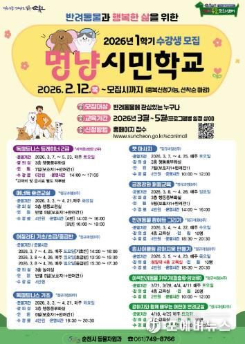 [ 포에버뉴스 오명숙 기자 ] 순천시는 오는 3월부터 반려동물과 반려인을 대상으로 한 시민 교육프로그램인 ‘멍냥시민학교’를 운영한다고 밝혔다.