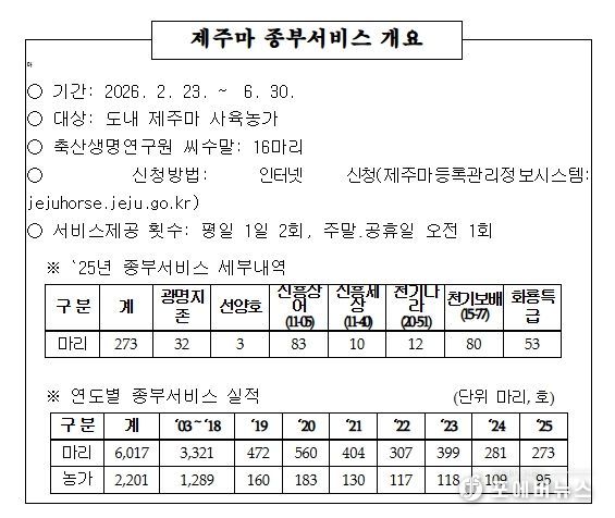 제주마 사육농가는 그동안 매년 씨수말 구입비용과 마리당 최대 350만원에 이르는 종부료를 부담해왔다. 이번 무상 서비스를 통해 생산비를 크게 줄이면서 우수한 혈통의 제주마(천연기념물 제347호)를 안정적으로 생산할 수 있게 된다.
