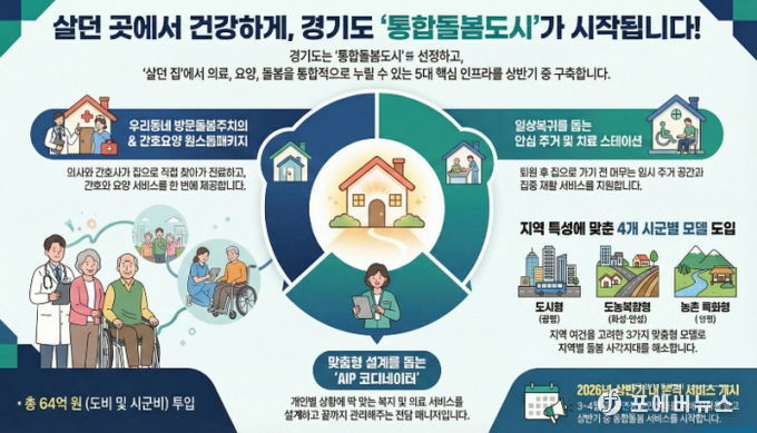 이번 사업은 오는 3월 ‘의료·요양 등 지역 돌봄의 통합지원에 관한 법률’ 시행에 앞서 각 지역의 인구 구조와 특성에 맞춘 ‘경기형 통합돌봄 모델’을 구축하려는 선제적 조치다. 경기도는 도비와 시군비 총 64억 원의 예산을 투입할 예정이다. 국정 제1 동반자로서 경기도가 통합돌봄 정책 기조를 가장 앞장서서 실천함으로써 경기도의 실행 리더십을 증명하는 의지를 담고 있다.
