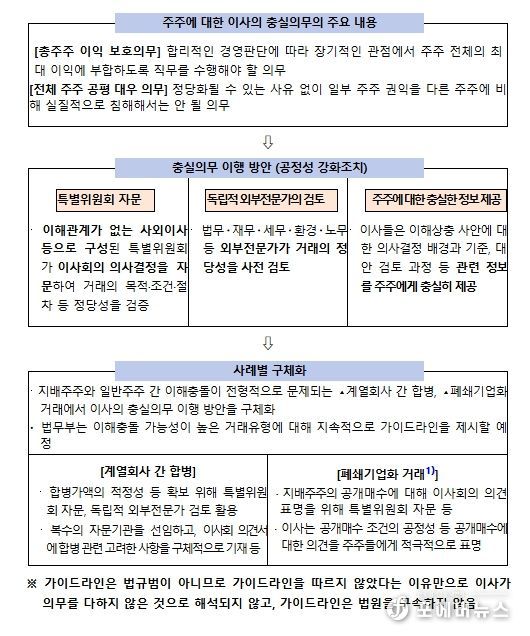 충실의무 이행방안에는 첫째, 이해관계가 없는 사외이사 등으로 구성된 ‘특별위원회’가 이사회 의사결정을 자문하는 방안, 둘째, 법무·재무·세무·환경 등 외부전문가가 거래의 정당성을 사전 검토하는 방안, 셋째, 이해상충 사안에 대한 이사의 의사결정 배경과 기준 등 관련 정보를 주주에게 충실히 제공하는 방안 등이 포함된다.