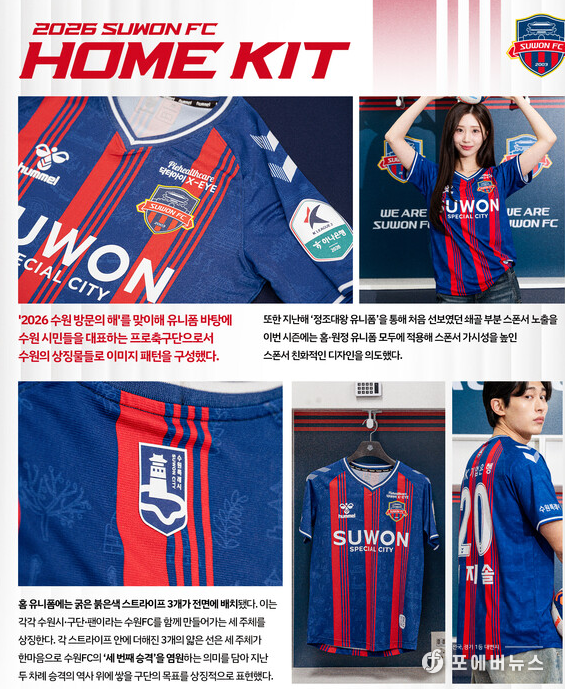 이는 ‘2026 수원 방문의 해’와 연계해 수원의 이야기를 유니폼으로 입는 경험을 제공하며, 지역 예술인과의 협업을 통해 완성돼 의미를 더했다. 또한 지난해 ‘정조대왕 유니폼’을 통해 처음 선보였던 쇄골 부분 스폰서 노출을 이번 시즌에는 홈·원정 유니폼 모두에 적용해 스폰서 가시성을 높인 스폰서 친화적인 디자인을 의도했다.
