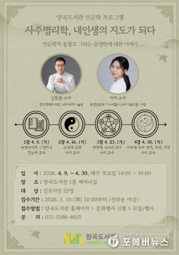 프로그램은 양곡도서관 세미나실에서 오후 2시부터 4시까지 진행되며, 김포시민 25명을 선착순으로 모집한다. 참가 신청은 3월 10일 오전 10시부터 양곡도서관 홈페이지 문화행사 신청 코너를 통해 할 수 있다.