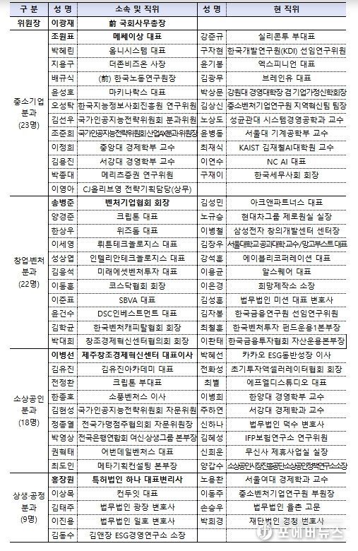 민관 정책협의회는 기업인, 민간 전문가, 학계, VC, 협·단체 등 총 72명의 위원으로 구성되어 출범일로부터 1년간 활동하게 된다. 또한 한성숙 중기부 장관과 이광재 전 국회사무총장이 공동위원장을 맡아 민관 정책협의회를 이끌어갈 예정이다.