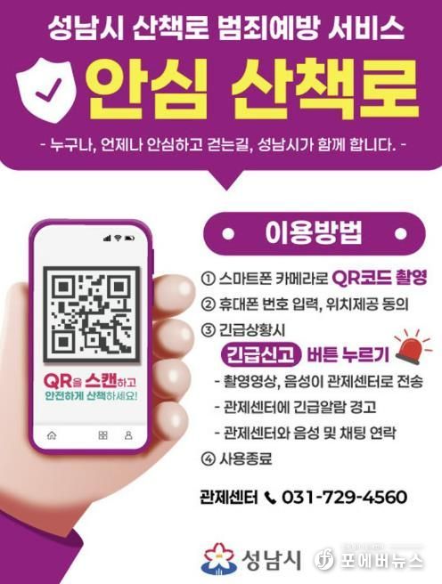 [ 포에버뉴스 김경순 기자 ] 성남시는 시민들이 보다 안심하고 산책로를 이용할 수 있도록 영장산과 불곡산 일대 산책로에 ‘범죄예방 서비스’를 6일부터 도입한다.