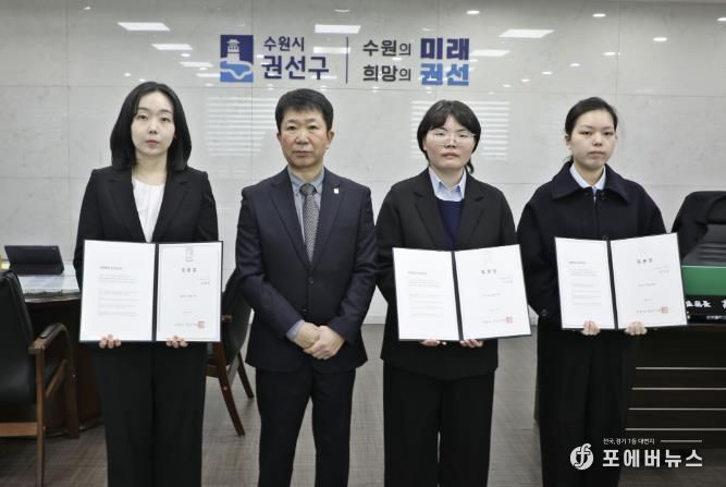 [ 포에버뉴스 김경순 기자 ] 수원시 권선구는 지난 5일, 권선구청 2층 집무실에서 신규 공직자 3명이 참석한 가운데 임용장 수여식을 개최했다.
