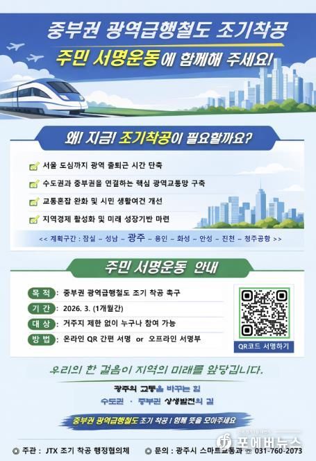 이번 서명운동은 ‘중부권 광역급행철도 조기 착공 행정협의체’가 주관하고 사업 관련 지방자치단체가 공동 취지 아래 지역별로 참여하는 방식으로 진행된다. 시는 서명에 담긴 시민 의견을 취합해 정부와 관계기관에 공식 전달할 계획이다.