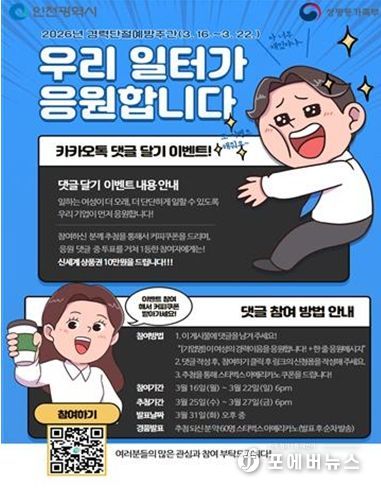 댓글달기 참여는 3월 16일부터 22일까지 인천광역새일센터 인스타그램 및 인천미추홀, 인천서구, 남동새일센터는 카카오톡 오픈채팅방을 통해 가능하며, 자세한 내용은 인천광역새일센터로 문의하면 된다.