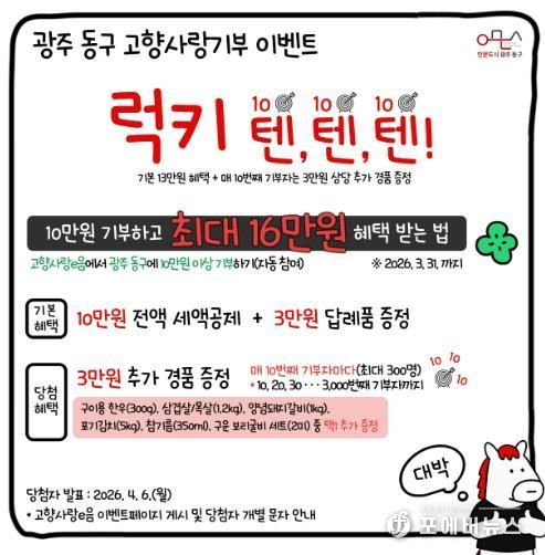 [ 포에버뉴스 오명숙 기자 ] 광주 동구는 고향사랑기부 참여 확대를 위해 특별 이벤트 ‘럭키 텐텐텐(Lucky 10·10·10)’을 3월 한 달간 운영한다고 밝혔다.