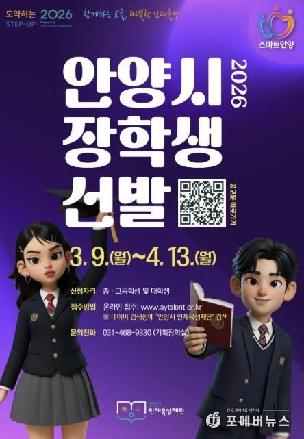 [ 포에버뉴스 김경순 기자 ] 안양시 인재육성재단은 안양시 중·고등학생 및 대학생을 대상으로 2026년 상반기 장학생을 선발한다고 9일 밝혔다.